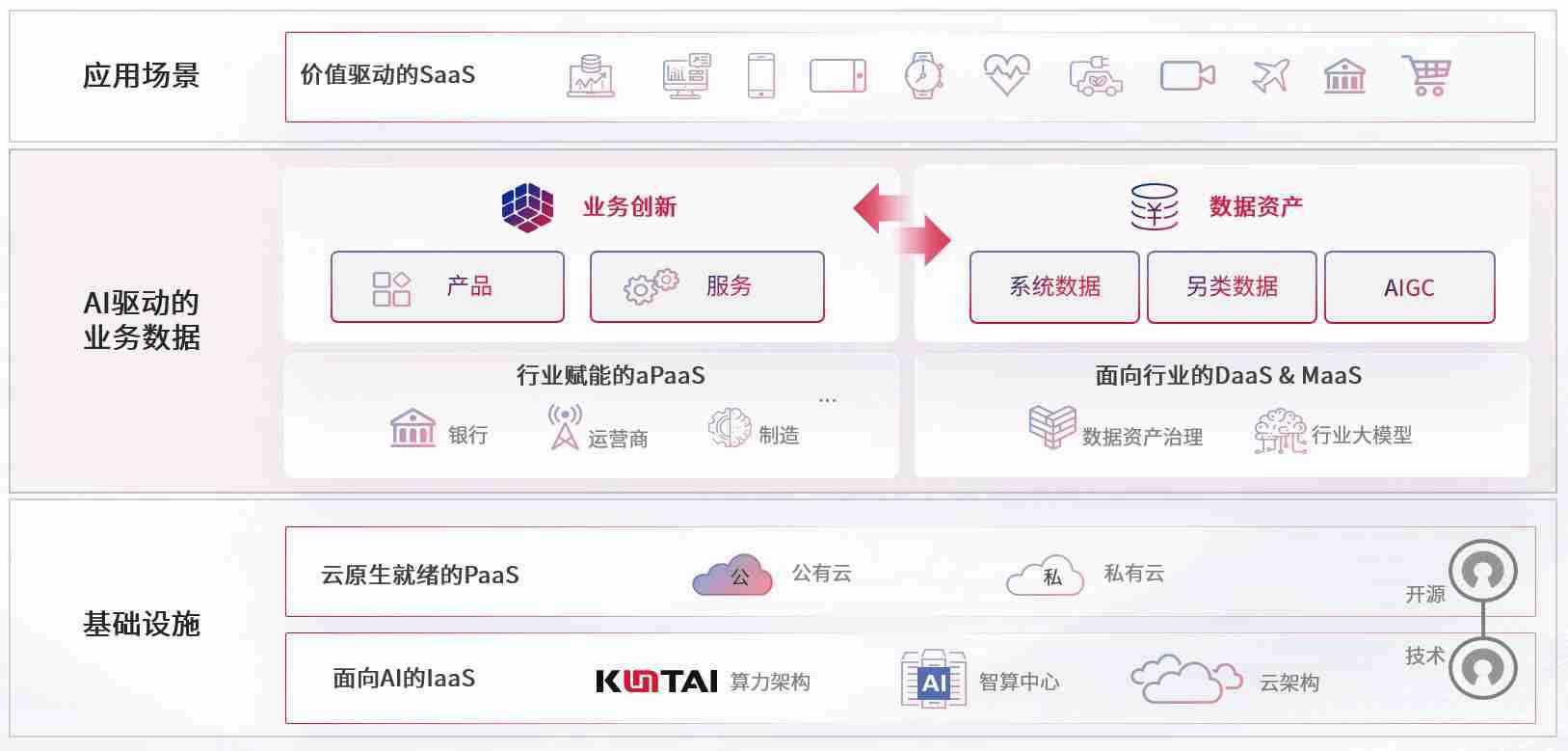 数字时代,,,,围绕企业数字化转型的关键要素,,www.kaiyun.com数码开创性的提出数云融合战略和技术体系框架,,着力在云原生、、数字原生、、、AI原生和信创产业上架构产品和服务能力,,为处在不同数字化转型阶段的快消零售、、、汽车、、、、金融、、、、医疗、、、、政企、、、、教育、、、运营商等行业客户提供泛在的敏捷IT能力和融合的数据驱动能力,,,,构建跨界融合创新的数字业务场景和新业务模式,,助力企业级客户建立面向未来的核心能力和竞争优势,,,,全面推动社会的数字化、、智能化转型升级。。。。